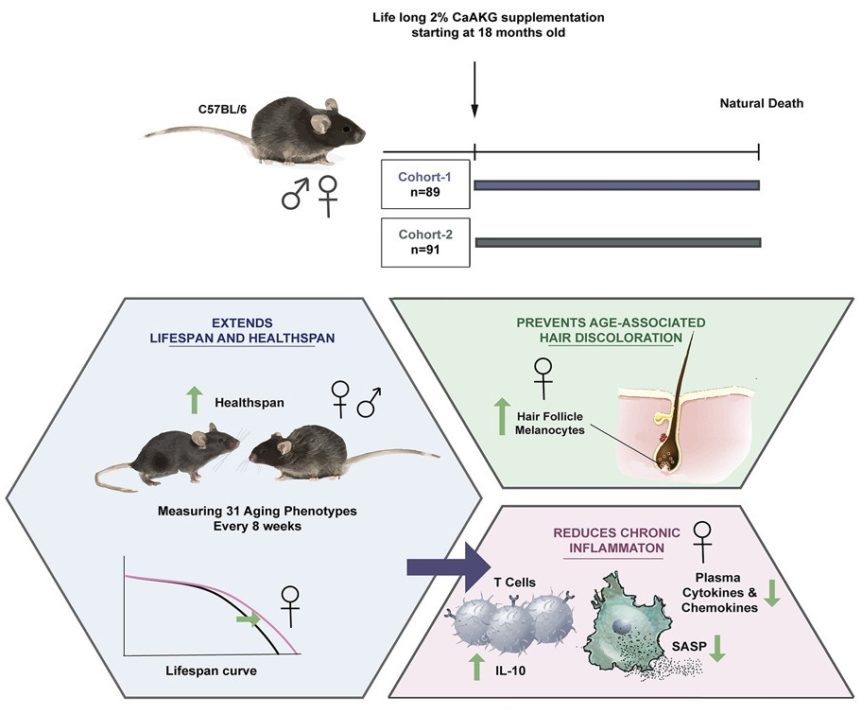 A research team led by Dr. Brian Kennedy has shown that administration of alpha-ketoglutarate (AKG), a natural metabolite in the citric acid cycle, improves both lifespan and healthspan in middle-aged mice.